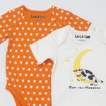 One design features our sweet hand-drawn “Over the Moon” cow resting beneath a crescent moon, while the second comes in a warm pumpkin base with a scattered star print—perfect for dreamy days and peaceful nights. Practical envelope necklines and popper fastenings make dressing a breeze.