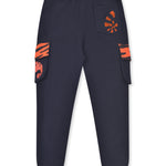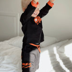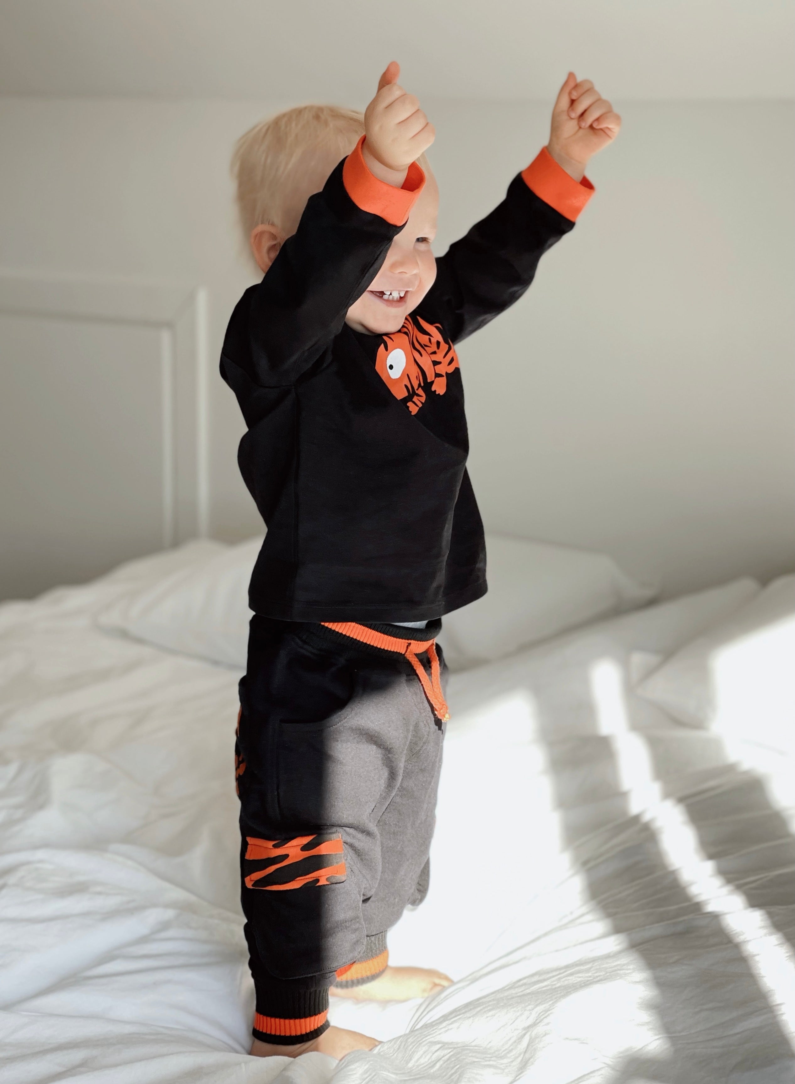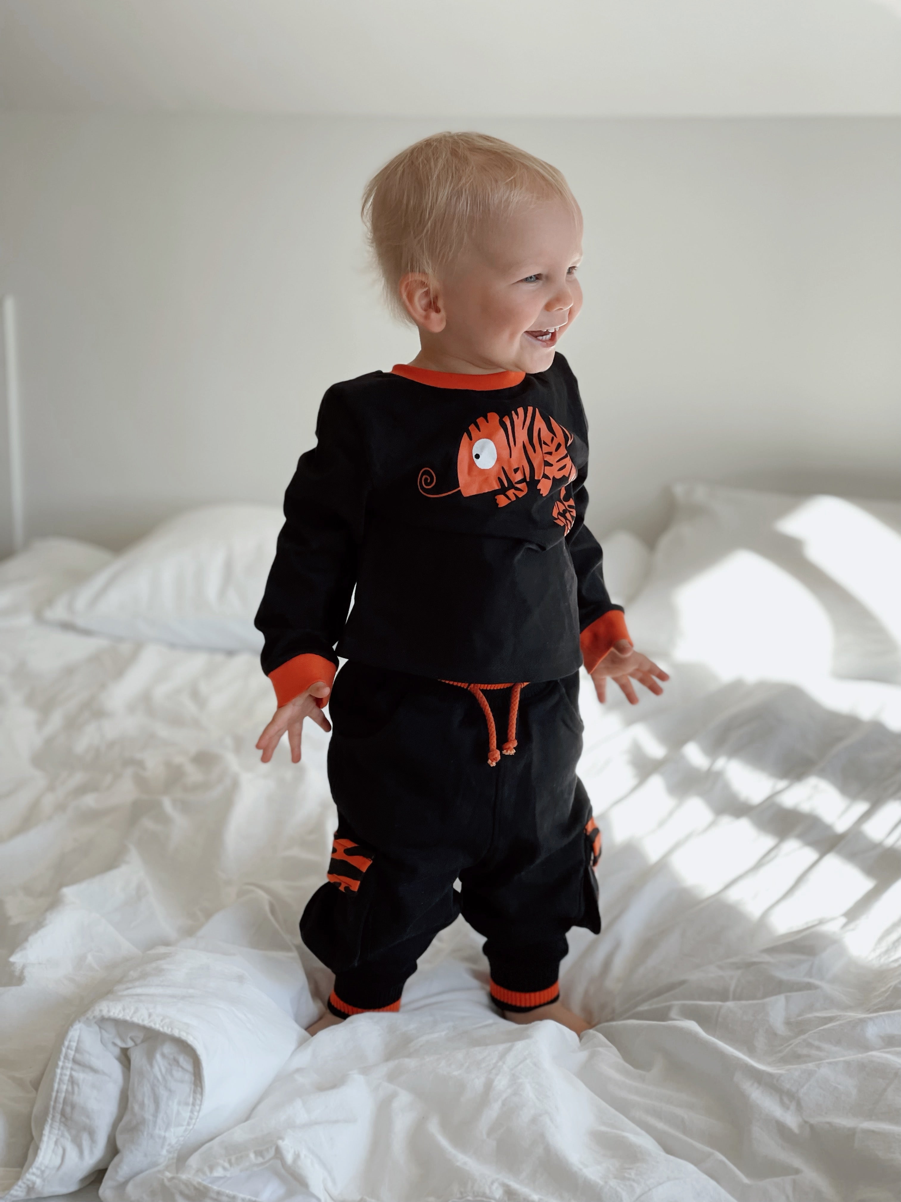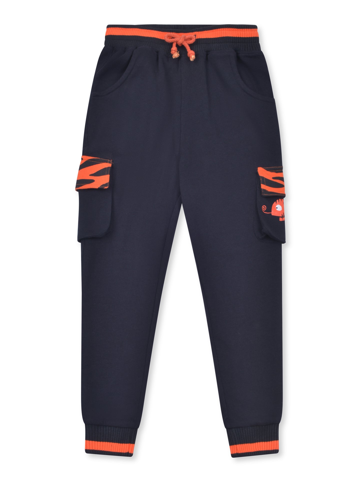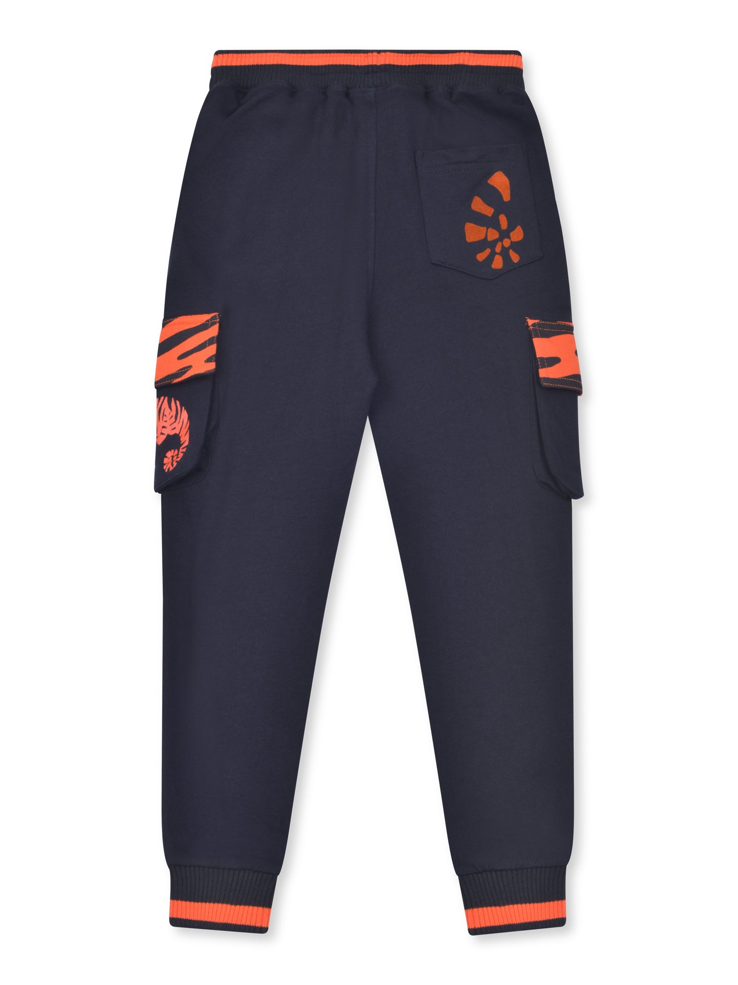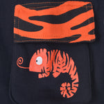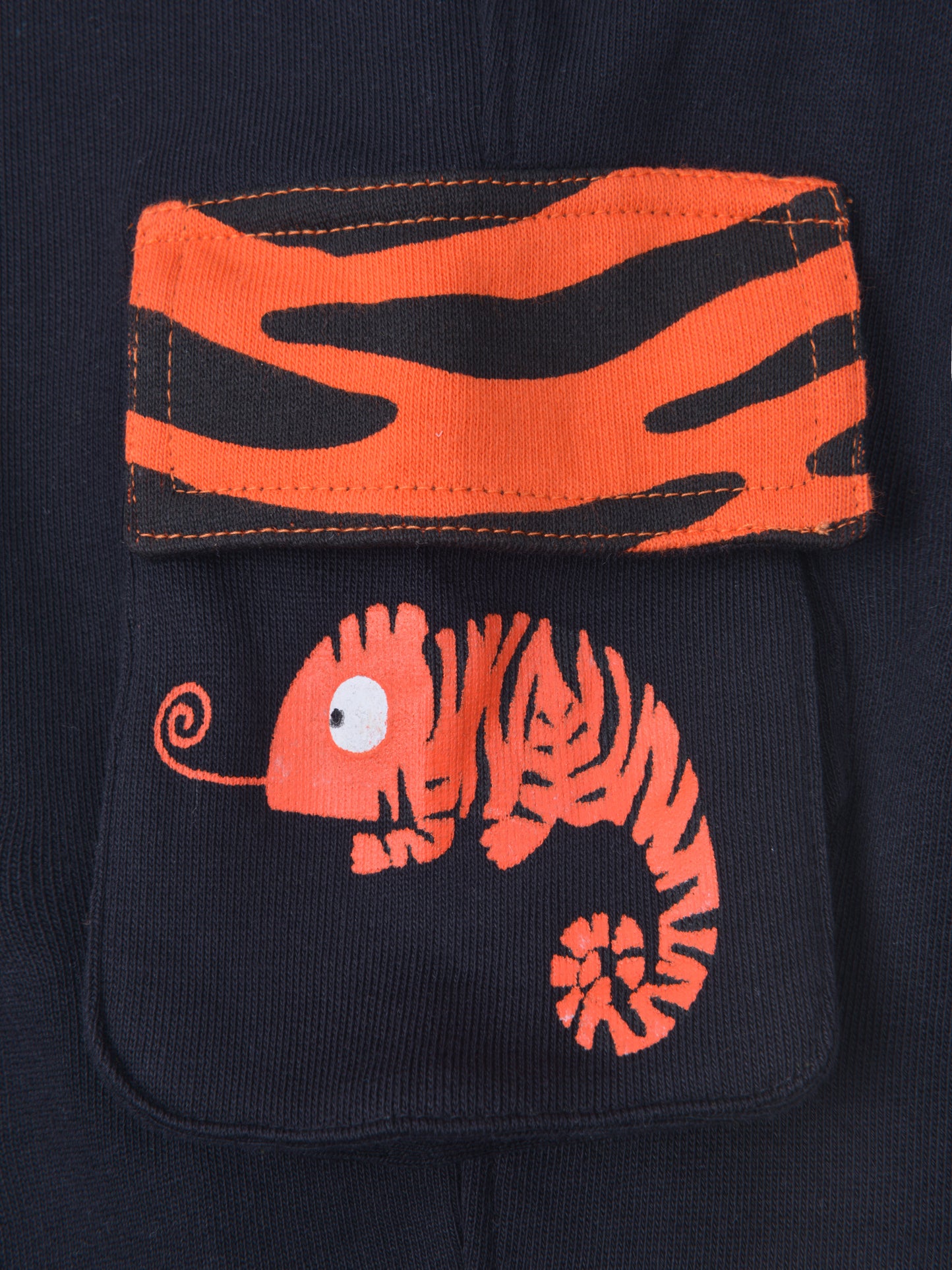 Comfy, fun and high-quality kids cargo pants. Made with soft and cosy organic cotton loopback, perfect for play, indoor or outdoor. Be one of the cool kids in these toddler joggers with 2 cargo pockets with orange tiger print trims and a printed cheeky chameleon graphic. Chunky ribs with orange trim and matching drawstrings with a cute flocked graphic on the back pocket. Made from super soft 100% Organic Cotton loopback, free from any nasty chemicals, making it gentle and soft on your little one's skin