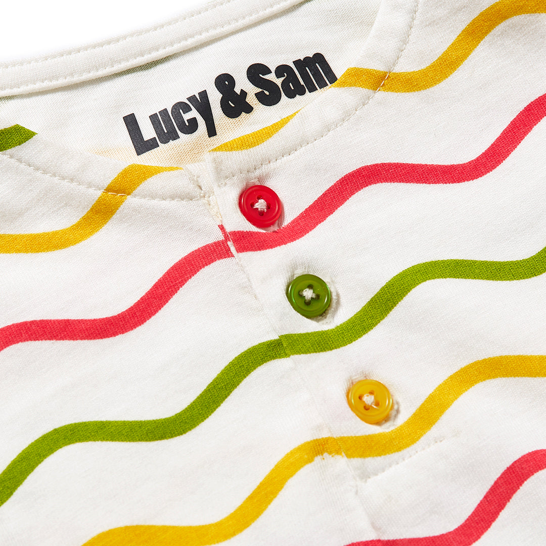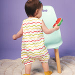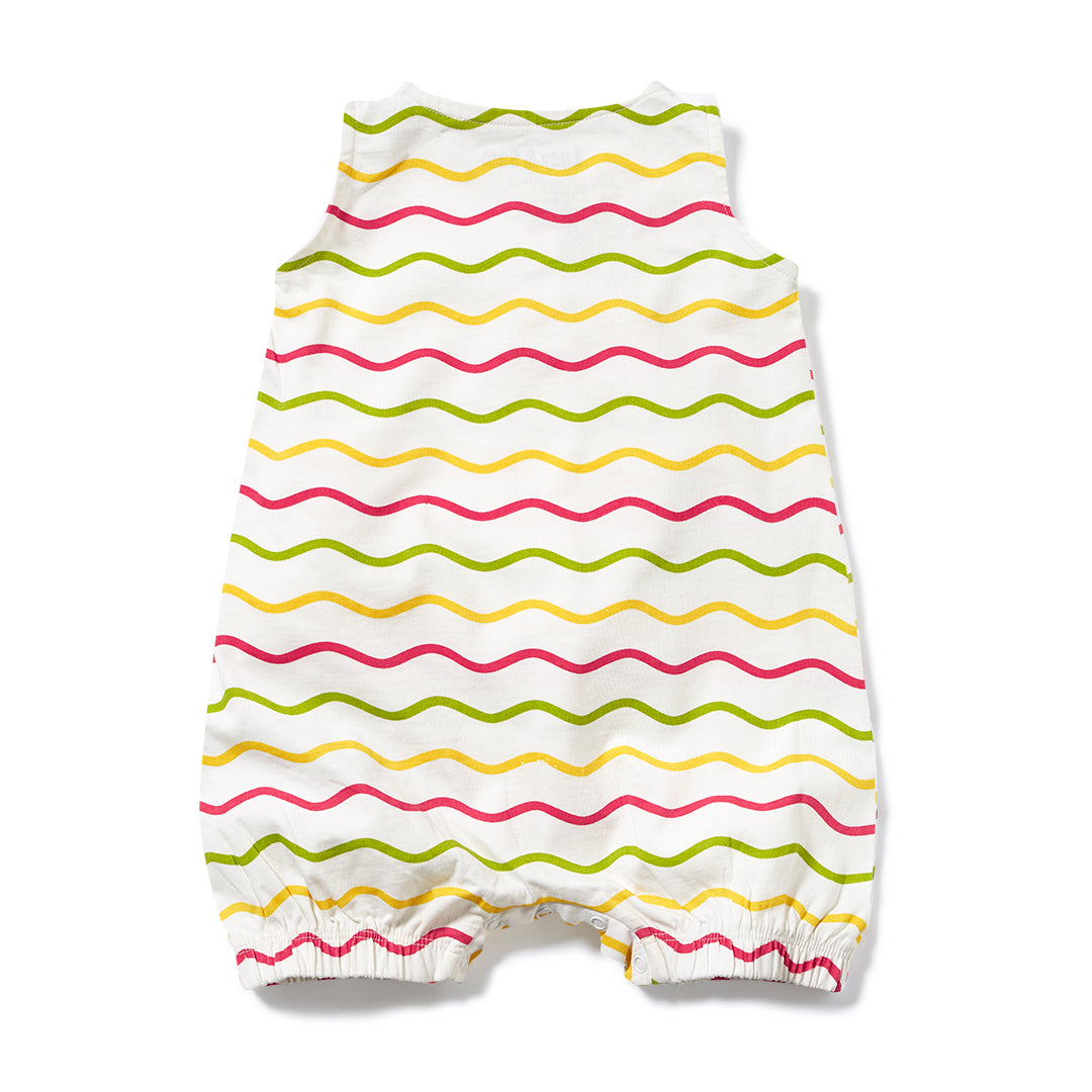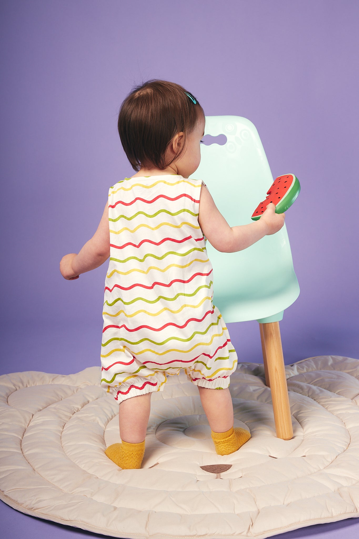 Shop our organic baby clothes. Bright colourful and fun baby and toddler all in one romper. This gorgeous piece in a three colour chevron is great for sunshine days. An airy romper with three colour buttons to match the chevron and a super cute kiwi turtle which little ones will love.