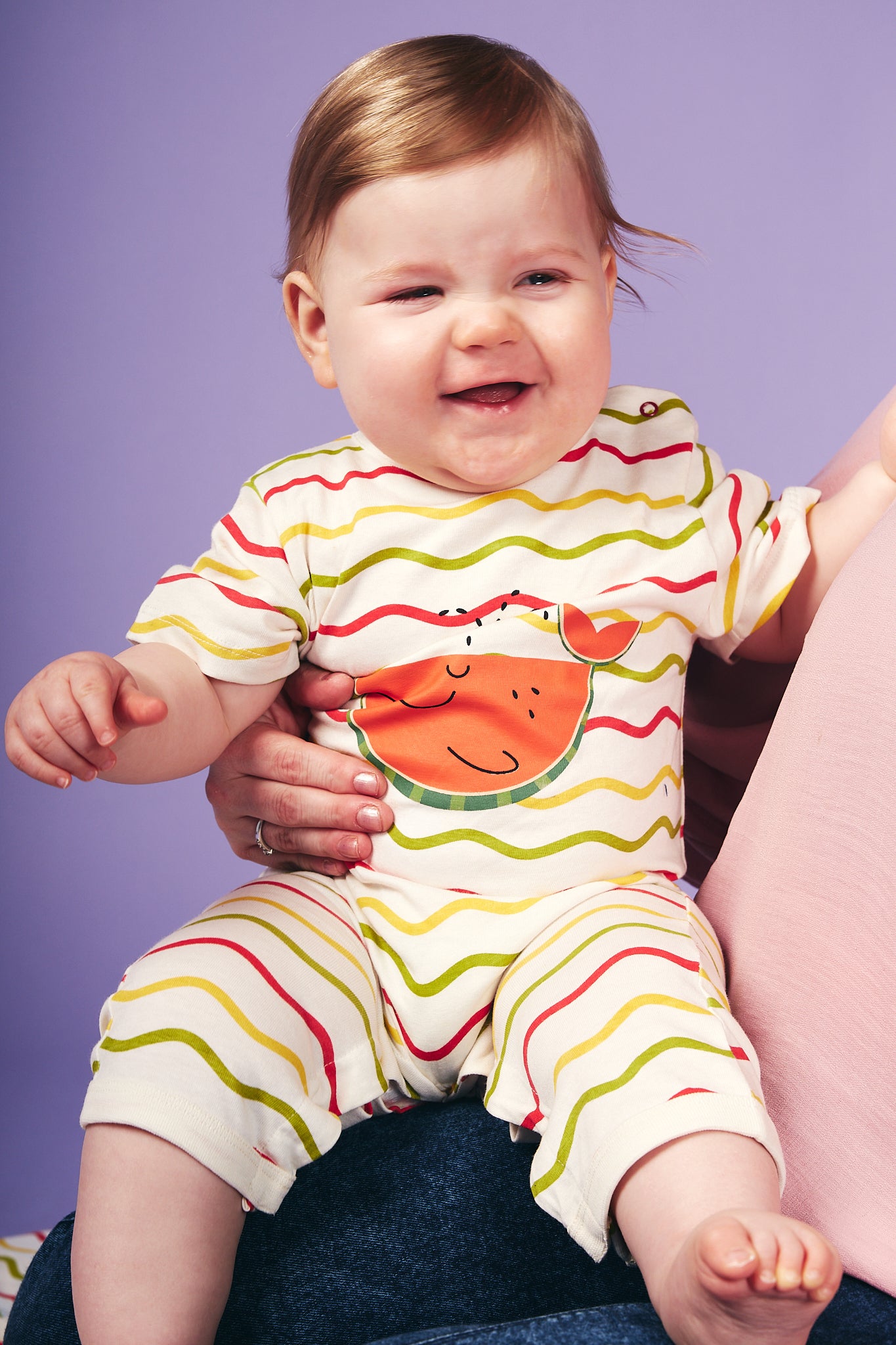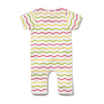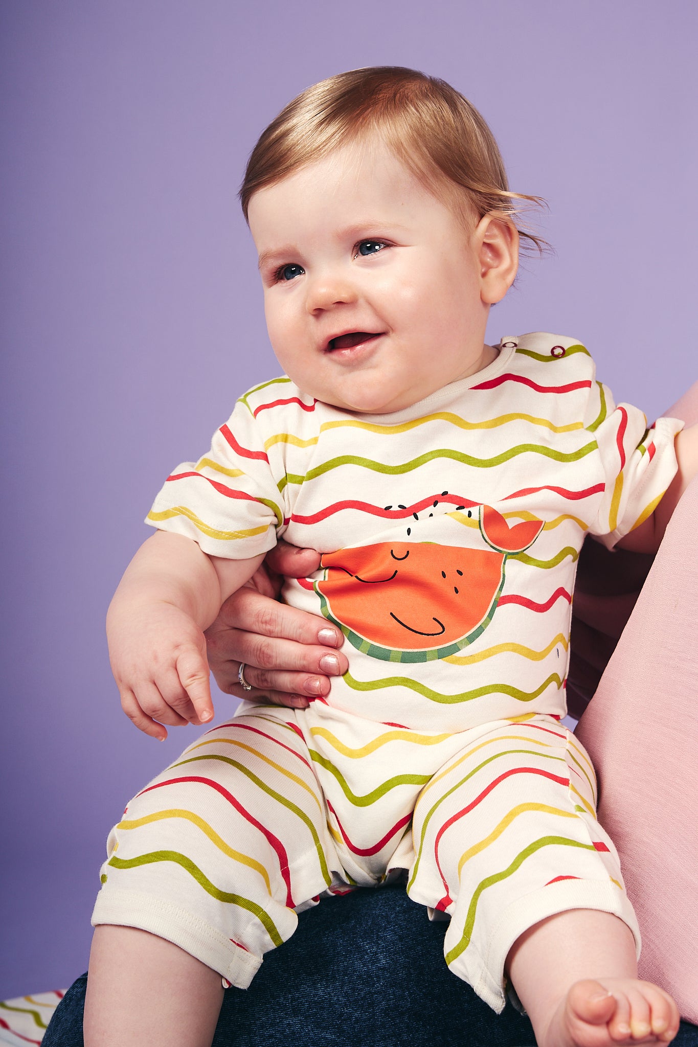 Cool, comfy and organic cotton baby clothes. Short sleeve unisex romper with a fun and playful graphic, is it a whale or is it melon, you decide! Shoulder and leg poppers make for easy changing and our three colour chevron stripe base adds a pop of colour to the natural organic base.