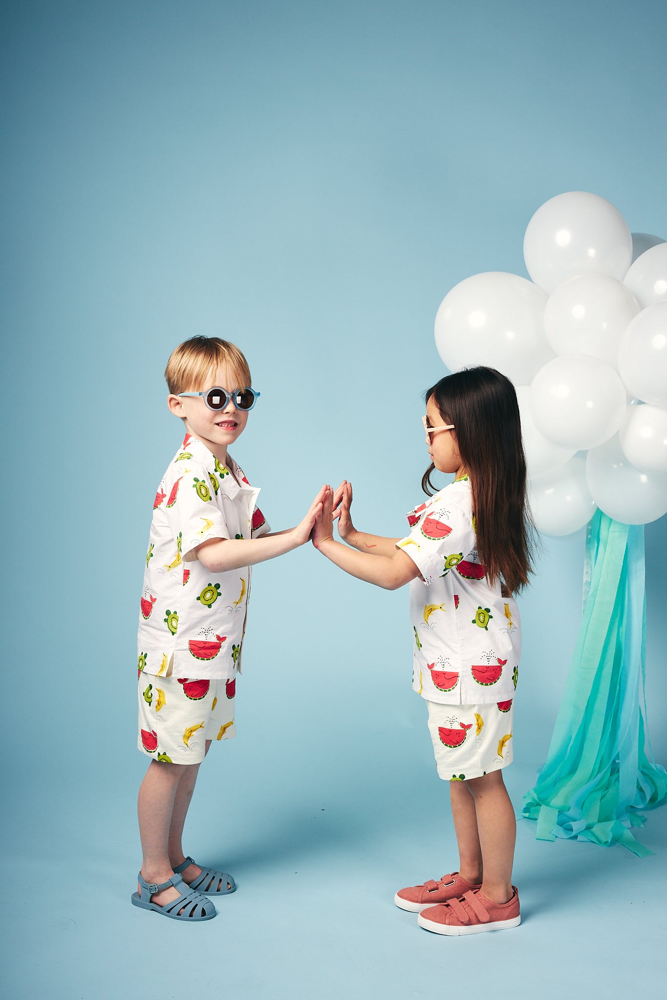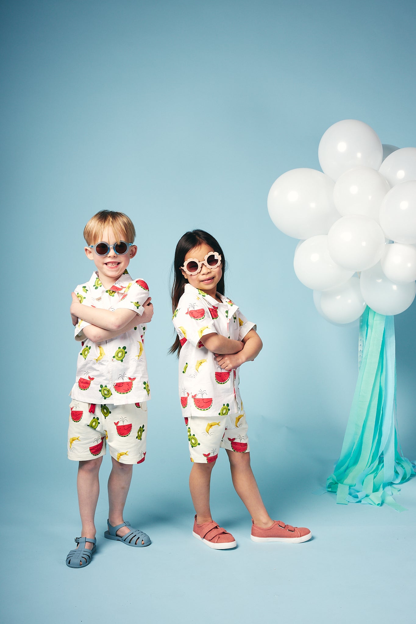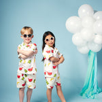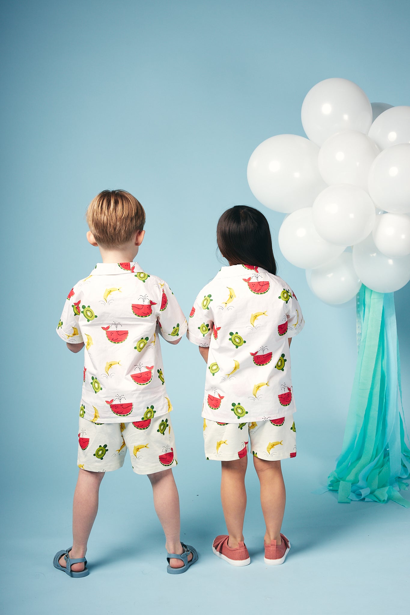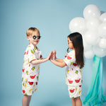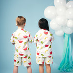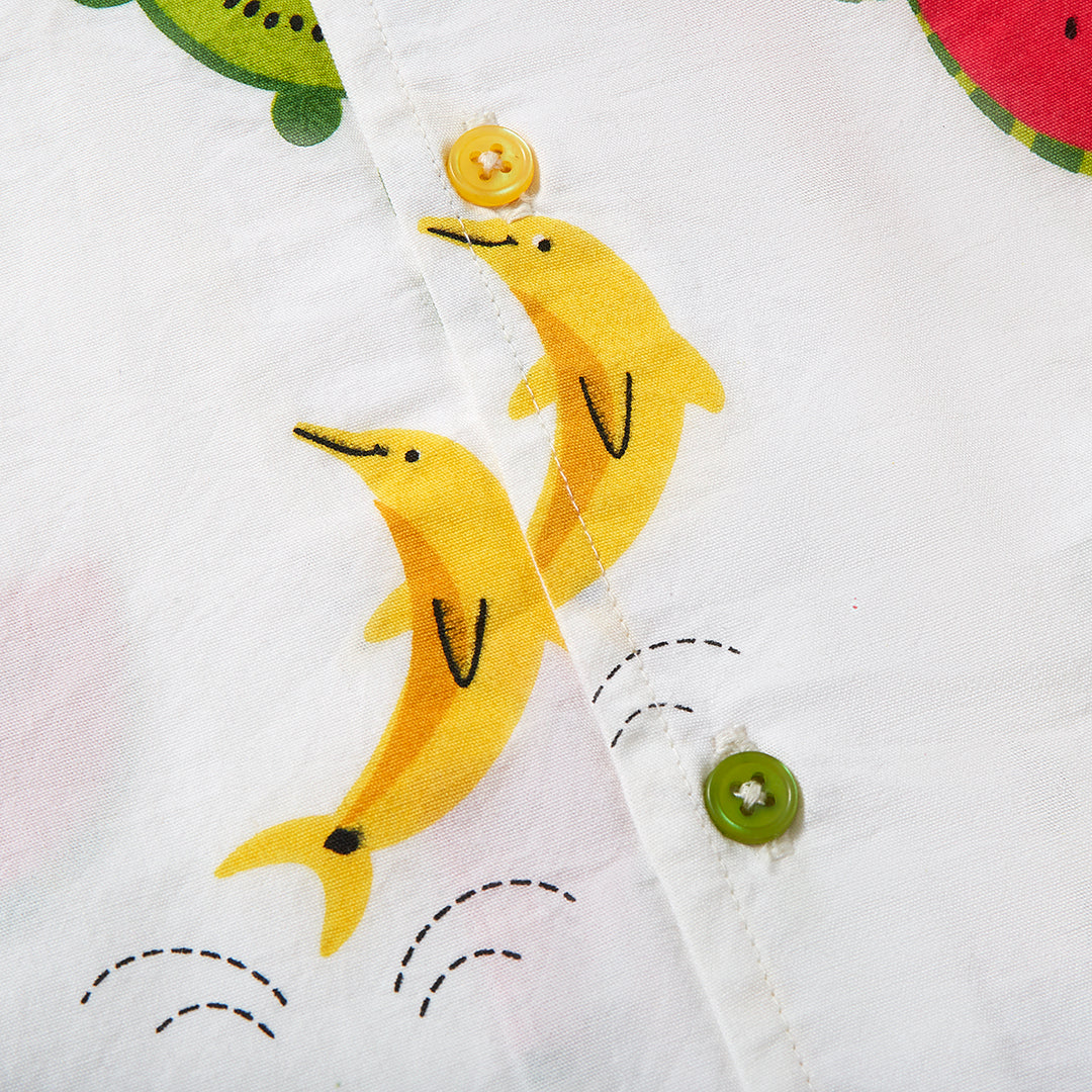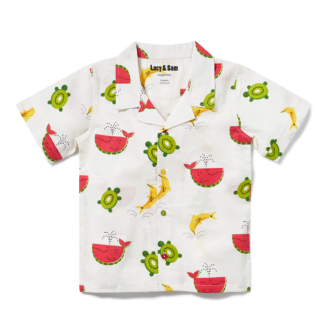 Shop our organic baby and kids clothing. Fun, cool and colourful shirt for toddlers and kids. This playful summer style is perfect for holidays or days in the sun, made from soft organic woven poplin in our signature Just Imagine all over print. Multi coloured buttons coordinate with the bright colourful print. Match this style with our shorts or joggers for a fabulous sunny look!