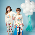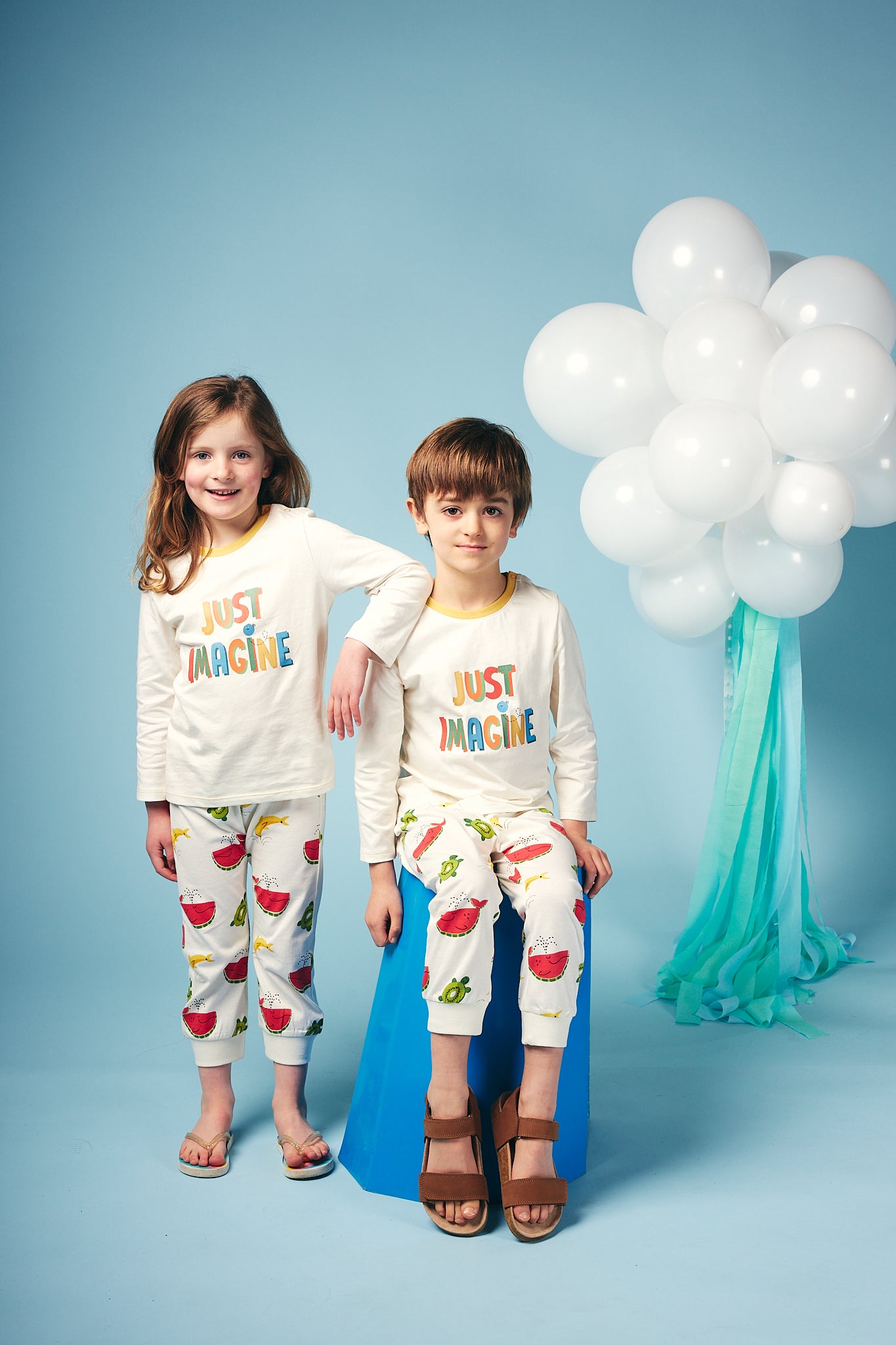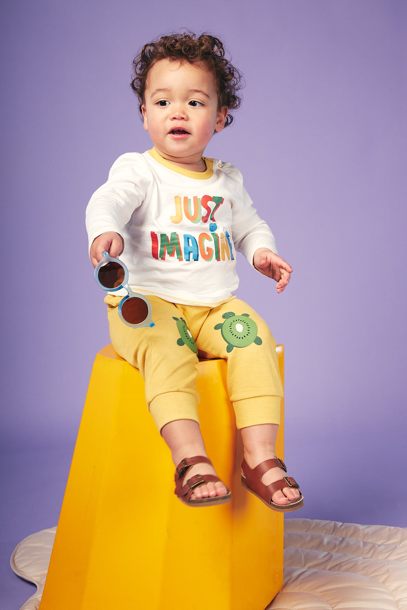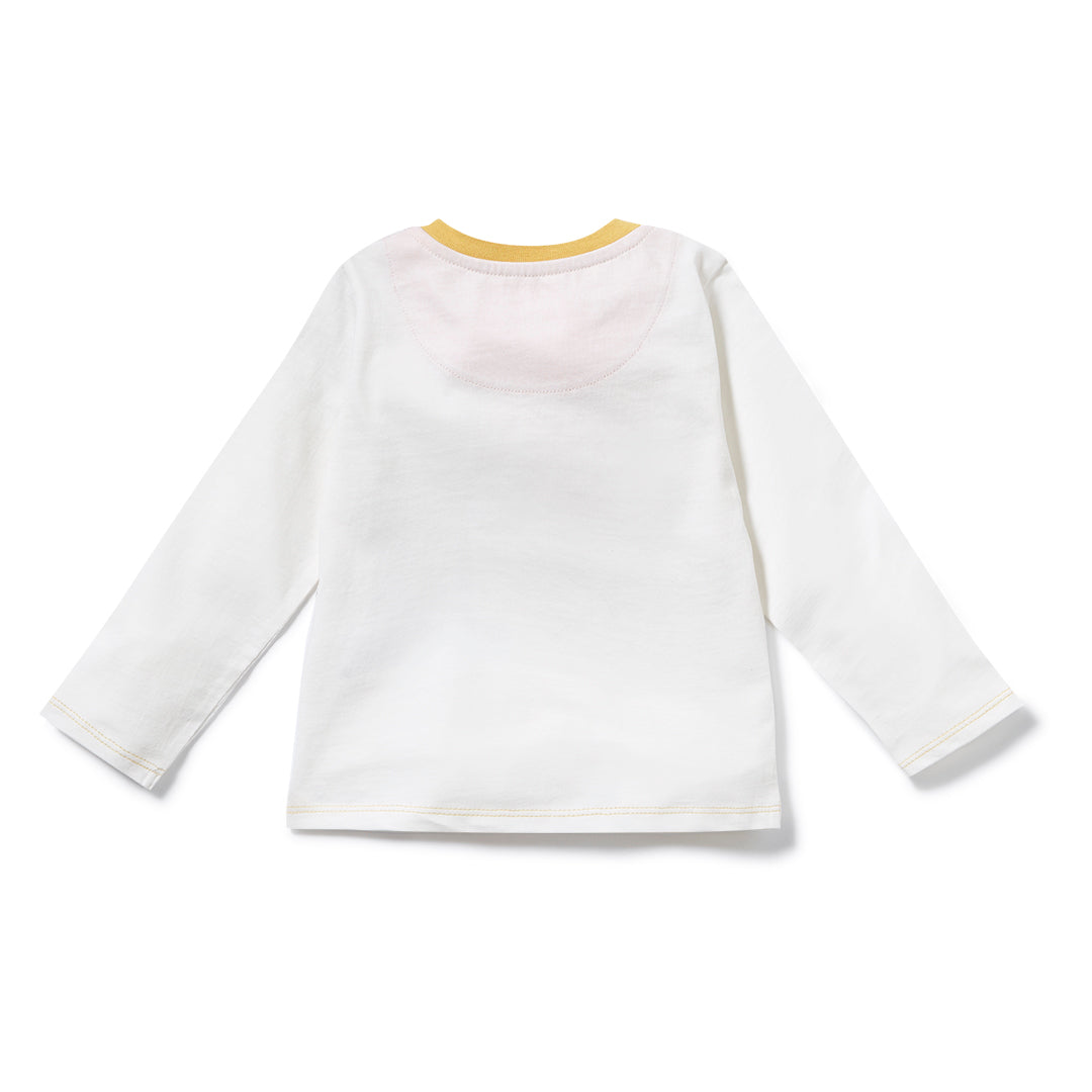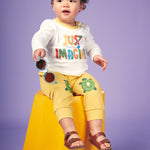 Shop our organic baby and kids clothes. Fun, colourful unique and unisex long sleeve tee shirt for babies, toddlers and kids! On a super soft and comfy organic jersey off white base sits our Just Imagine five colour slogan with shading to make the words pop! Yellow neck rib and hem stitching coordinates this style with the rest of the collection. This  t-shirt can be mixed and matched with any of our bottoms and a great layering up piece with our colour coordinated sweats and hoodies.