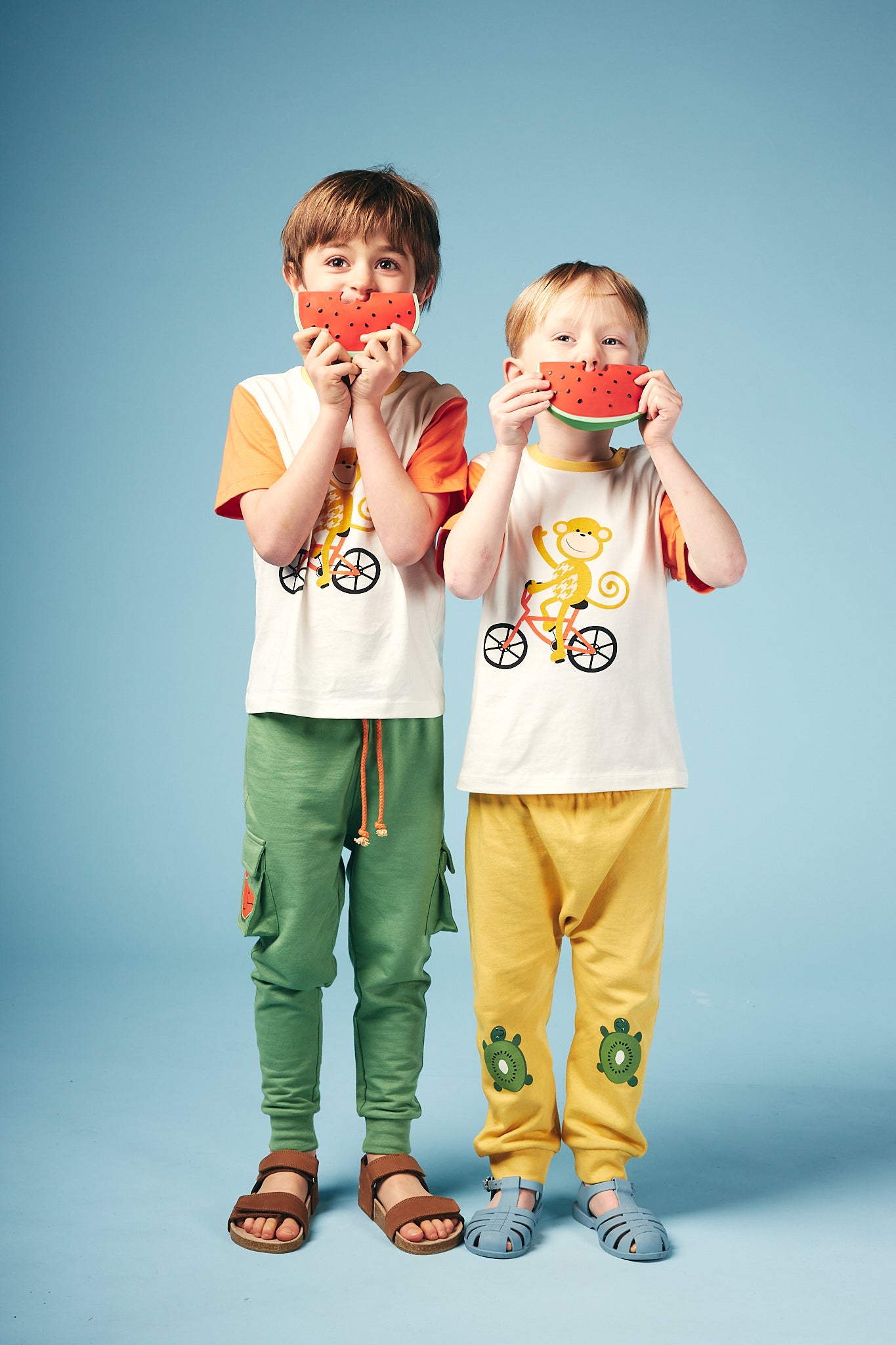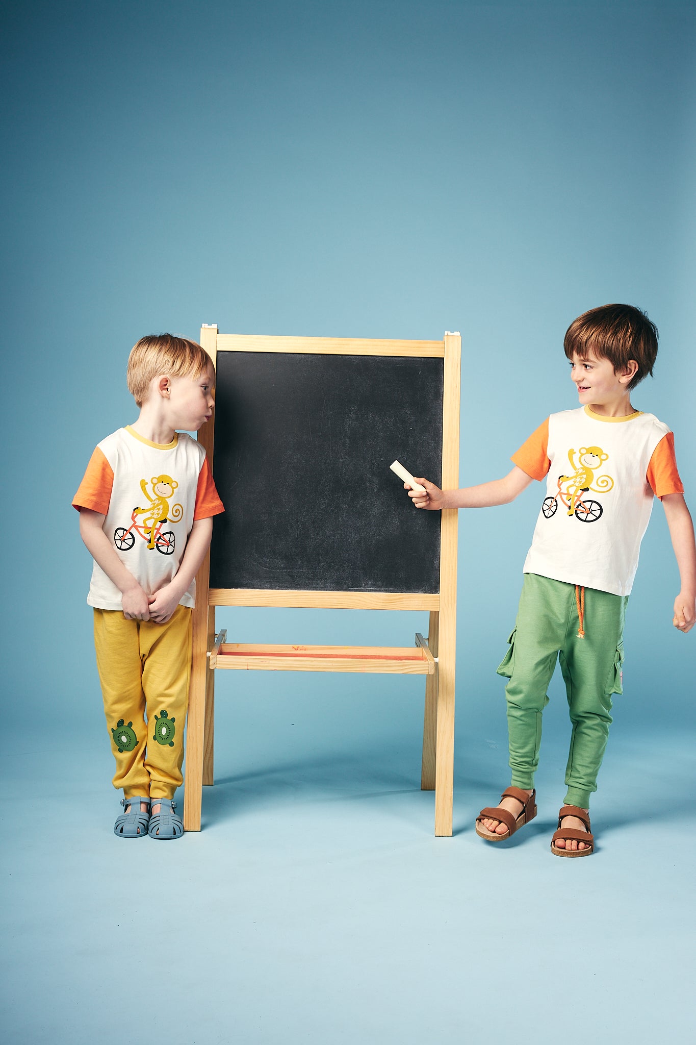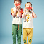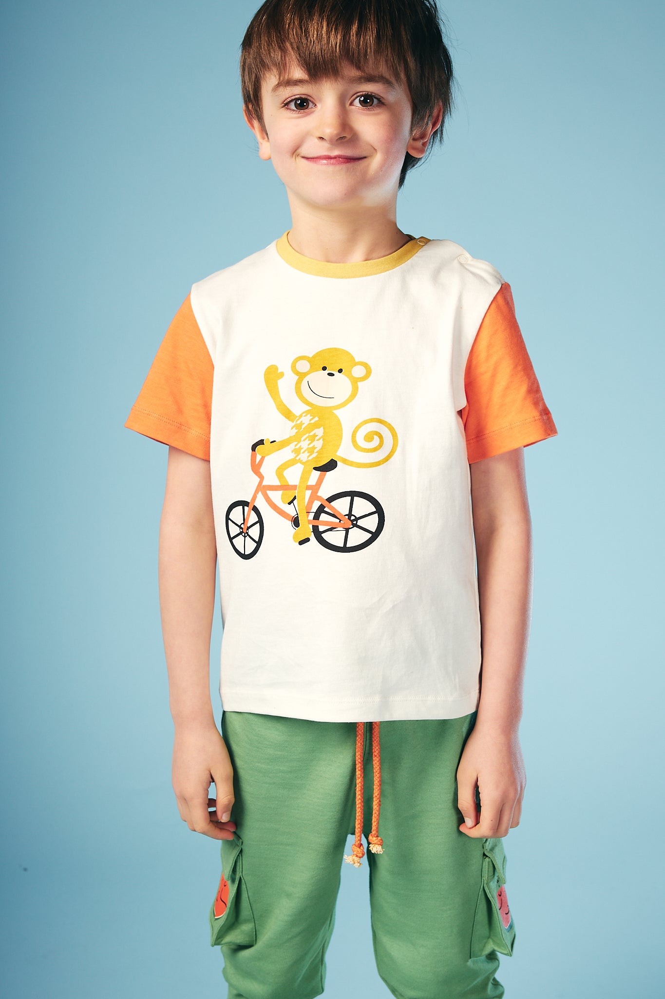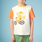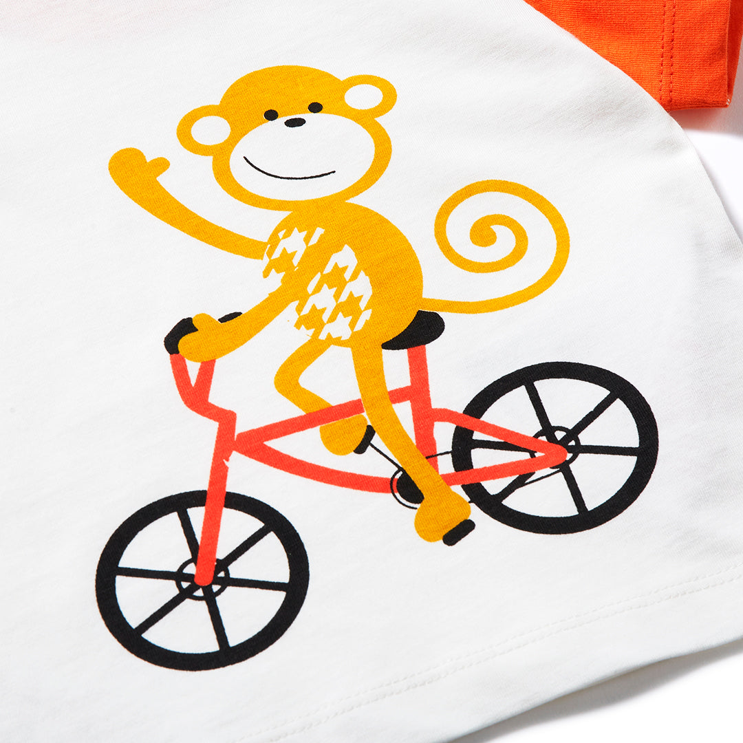 Shop our organic cotton baby and kids clothes. Fun, colourful, essential baby toddler long sleeve tee. Long term fans may recognise our monkey and bike designs, now sat together in this fun and cheeky graphic. A big bold monkey on a bike graphic sits on an off white base with orange sleeves and yellow neck rib.  Pair up with our joggers and leggings or layer up with our sweats to complete the look!