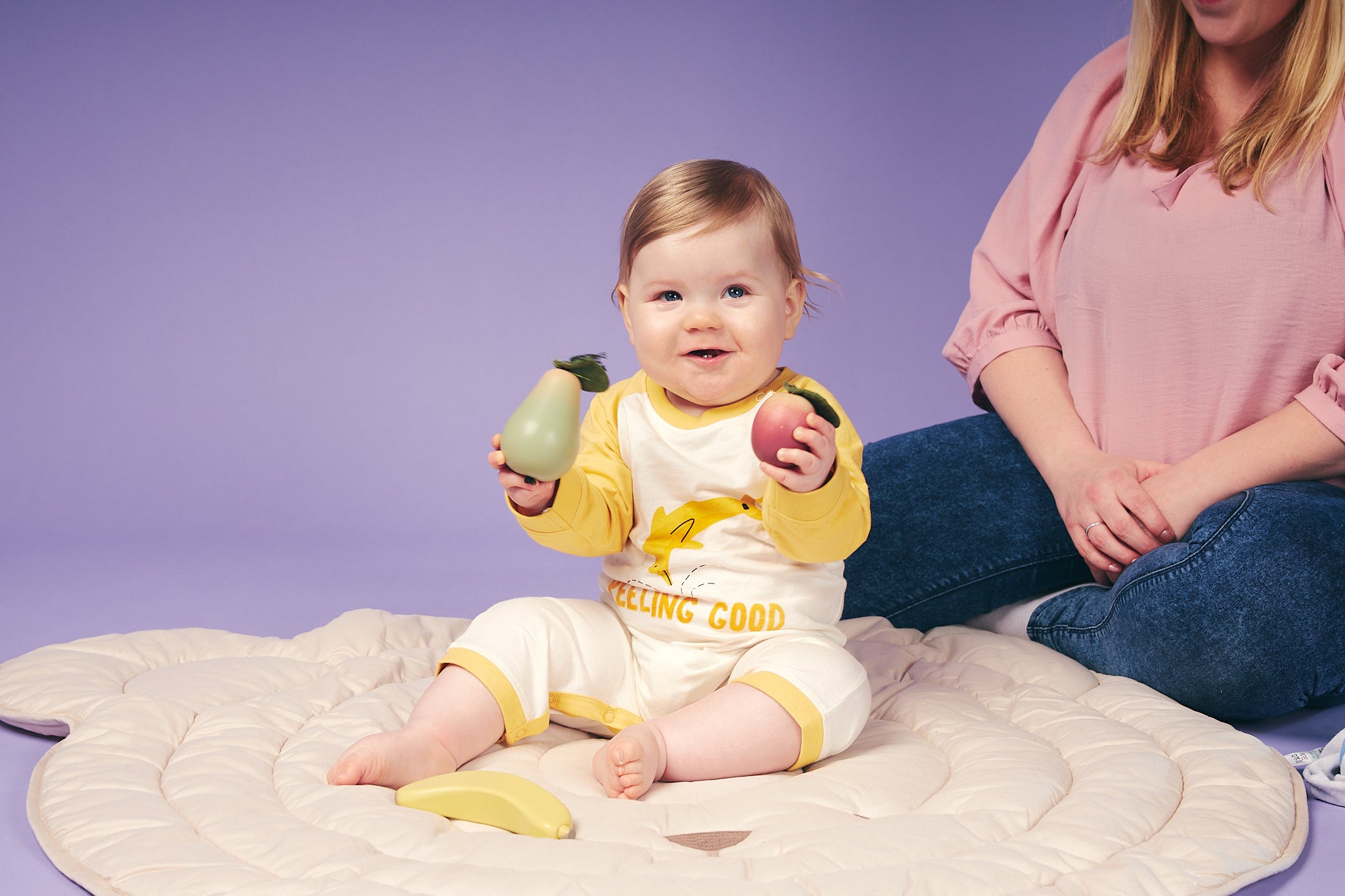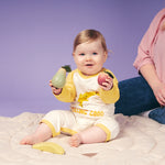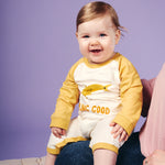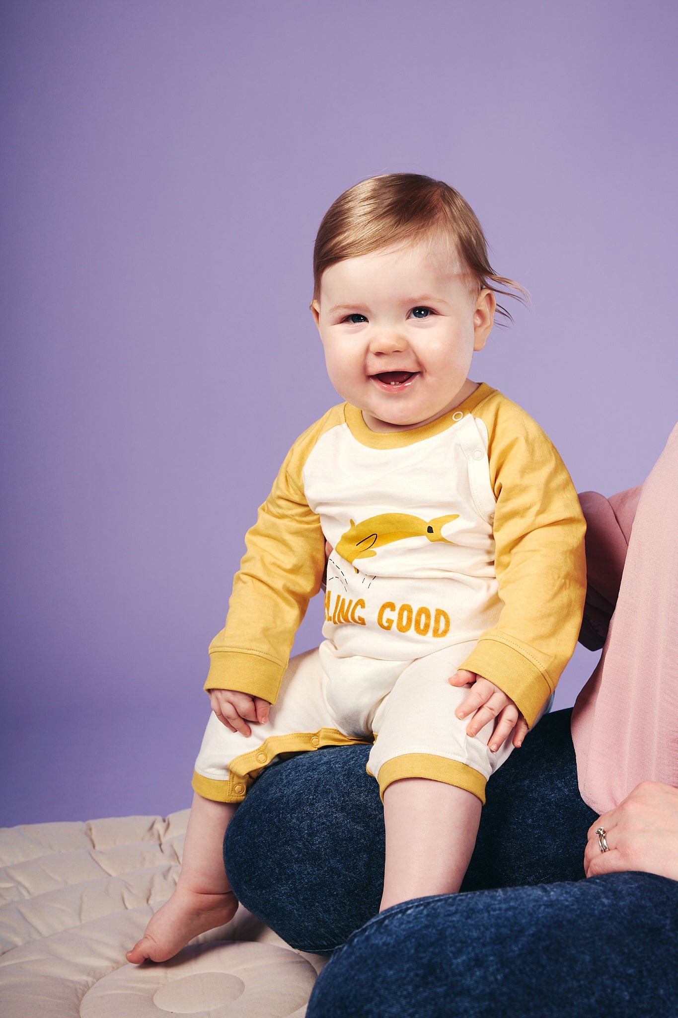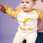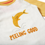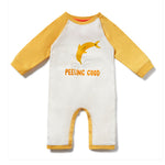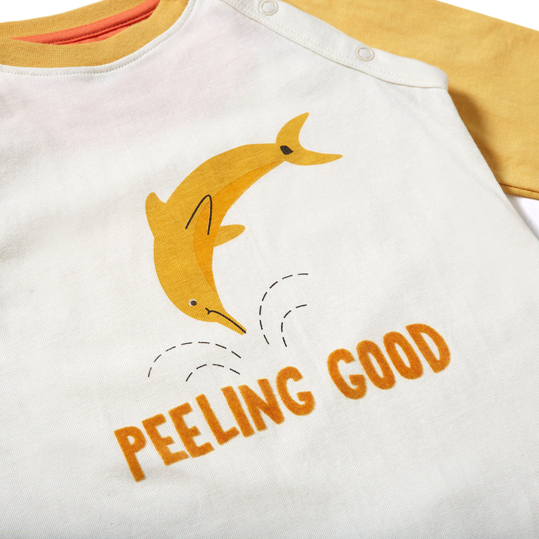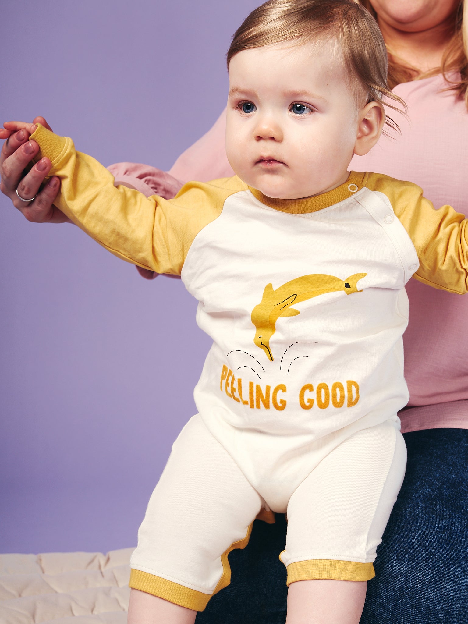 I PEEL GOOD! Shop our organic baby grows. Bright comfy and fun unisex playsuit on a soft off white base with yellow raglan sleeves, leg cuffs and poppers. Cute, colourful printed banana dolphin graphic and a textured flocked "Peeling Good" slogan that little ones will love. Three neck poppers and seven leg poppers for easy changing.