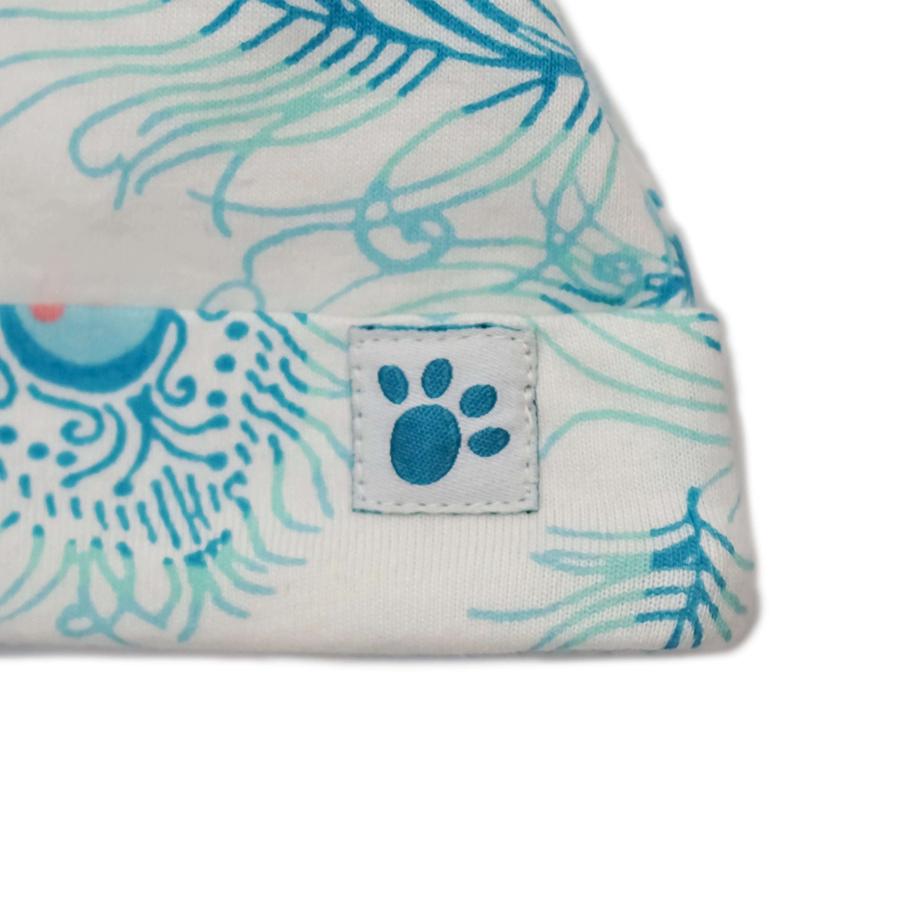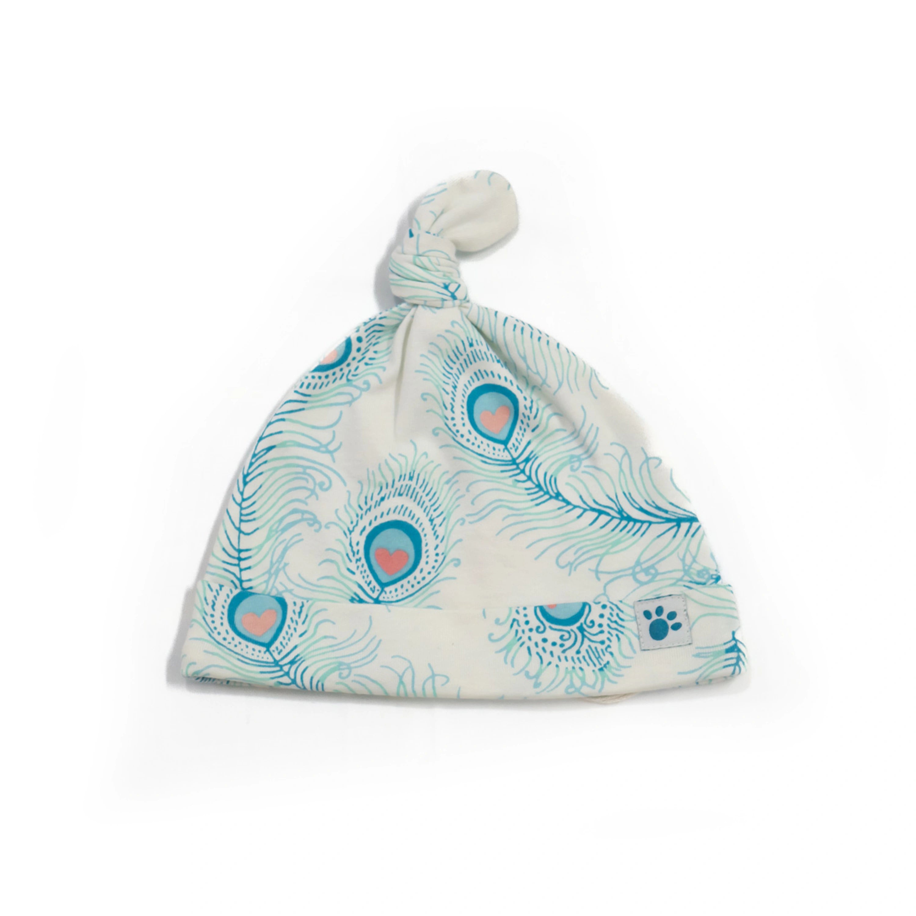 Featuring a delicate teal peacock feather print with signature heart-shaped eyespots on a creamy base, this hat is both whimsical and wearable. The knotted top detail and folded brim ensure a comfy, secure fit while adding extra character.