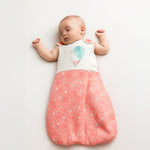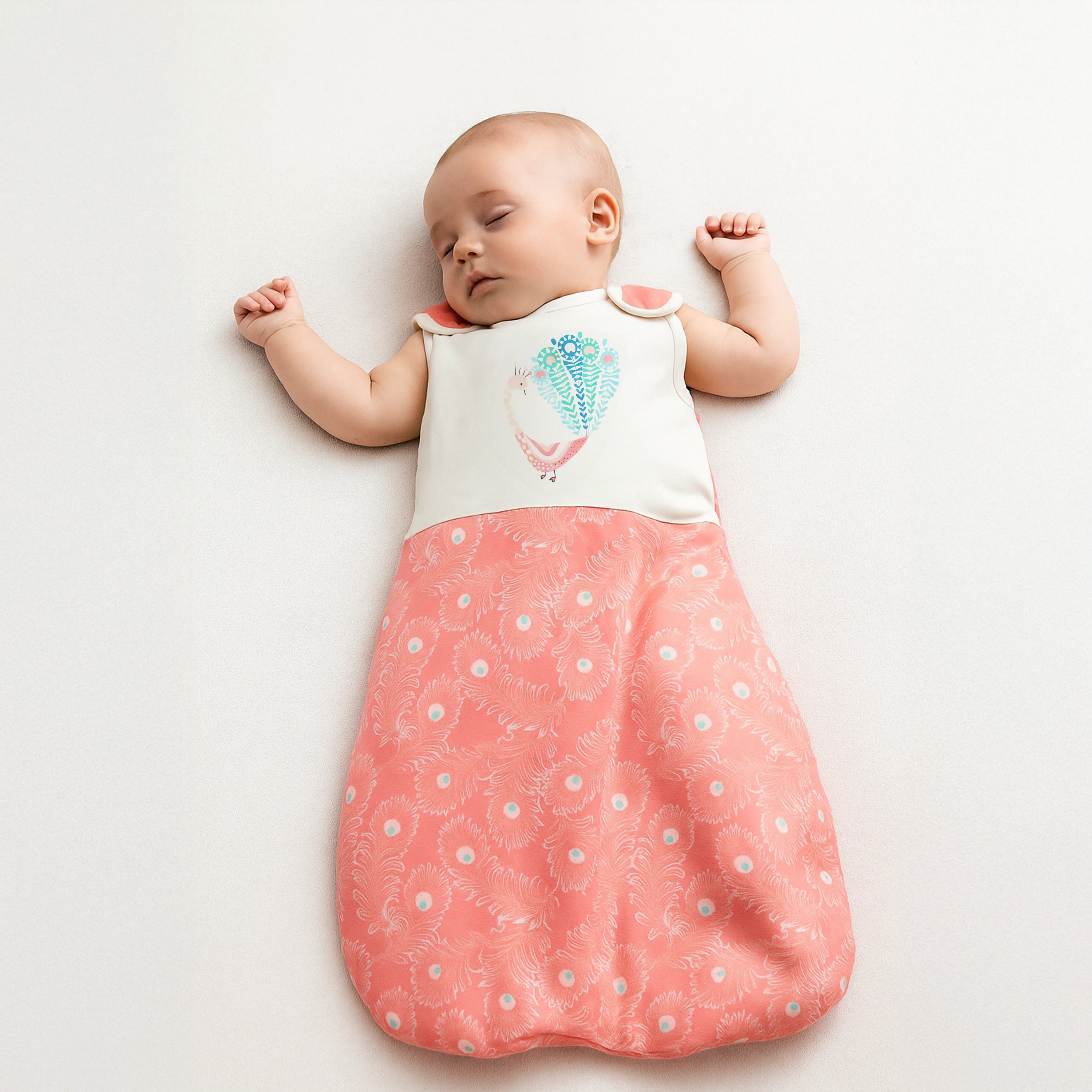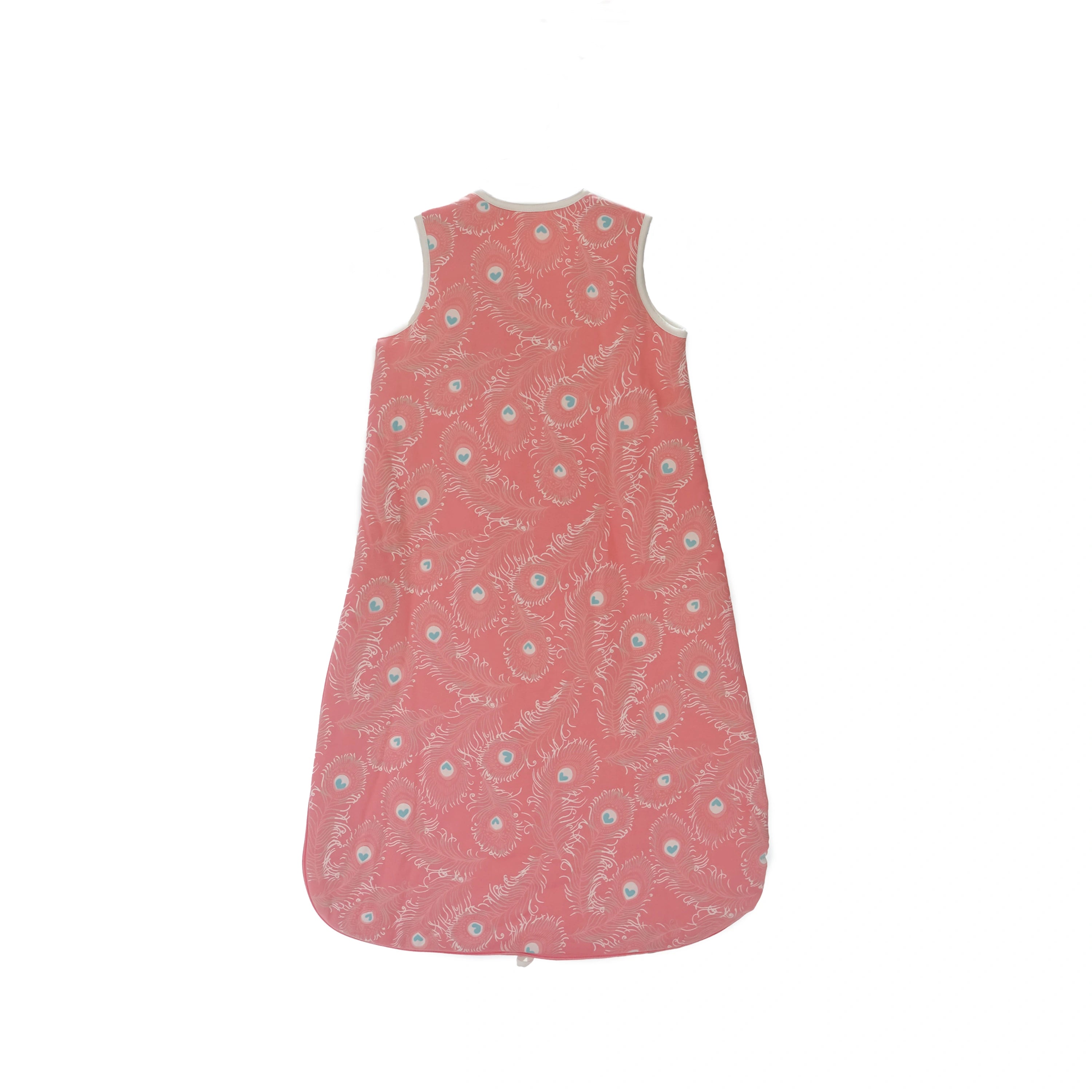 The top features a hand-illustrated peacock perched proudly on a creamy base, while the lower half showcases a flowing blush pink feather print with heart-shaped eyespots. With a 2.5 TOG thermal rating, it's ideal for cooler nights, and the side zip and shoulder poppers ensure easy night-time changes and a secure fit.