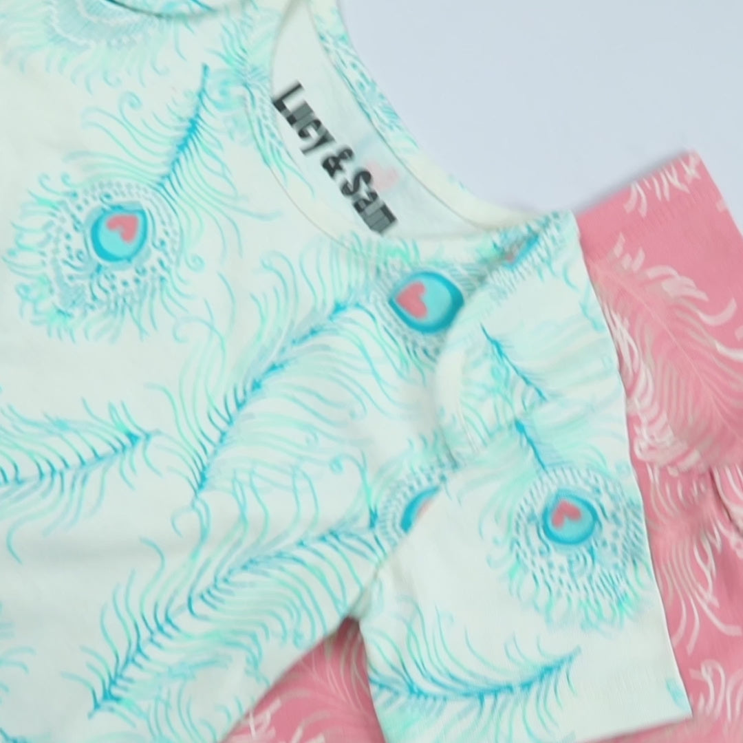 This handy duo includes one bodysuit in a rich pink with white peacock feathers and another in a creamy base with teal feathers, both featuring signature heart-shaped eyespots for a sweet and striking look. With envelope necklines and snap fastenings, changes are quick and fuss-free—perfect for busy days and peaceful naps.