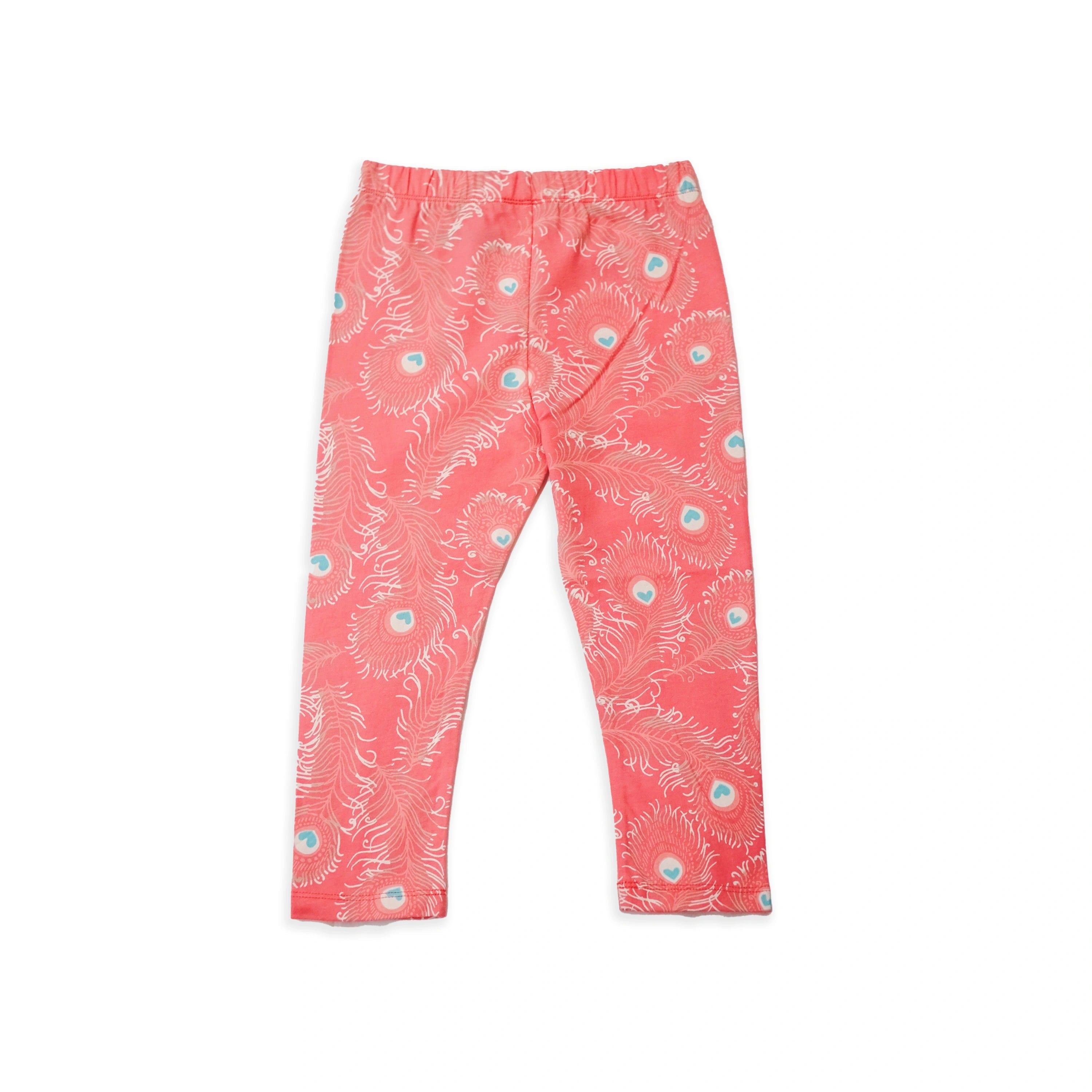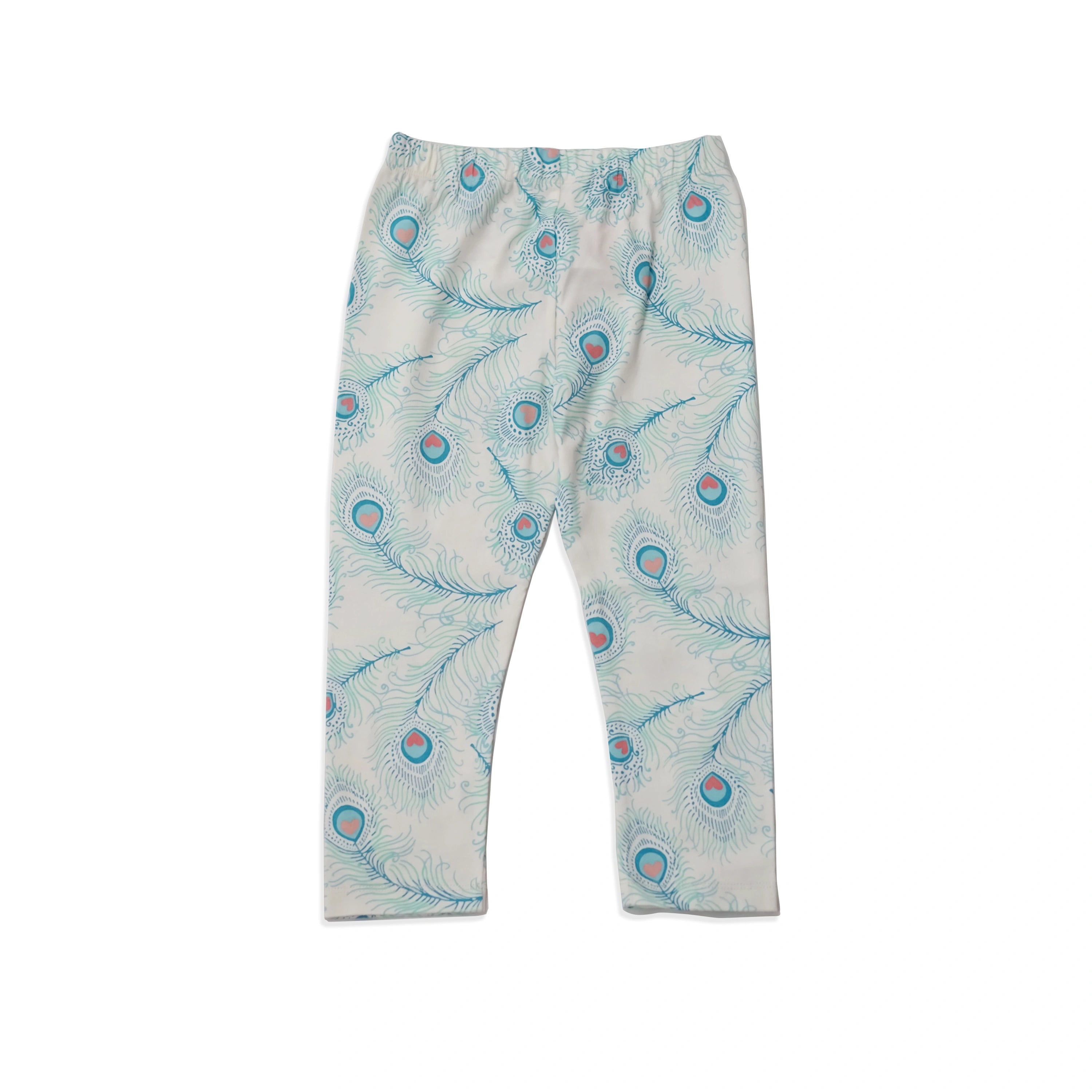This duo includes one pair in creamy white with a teal peacock feather print, and another in a blush pink with matching white feathers—both featuring signature heart-shaped eyespots for an extra sweet touch. With elasticated waistbands and a slim yet comfy fit, they’re perfect for play, layering, and lounging.