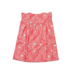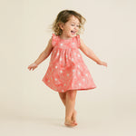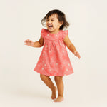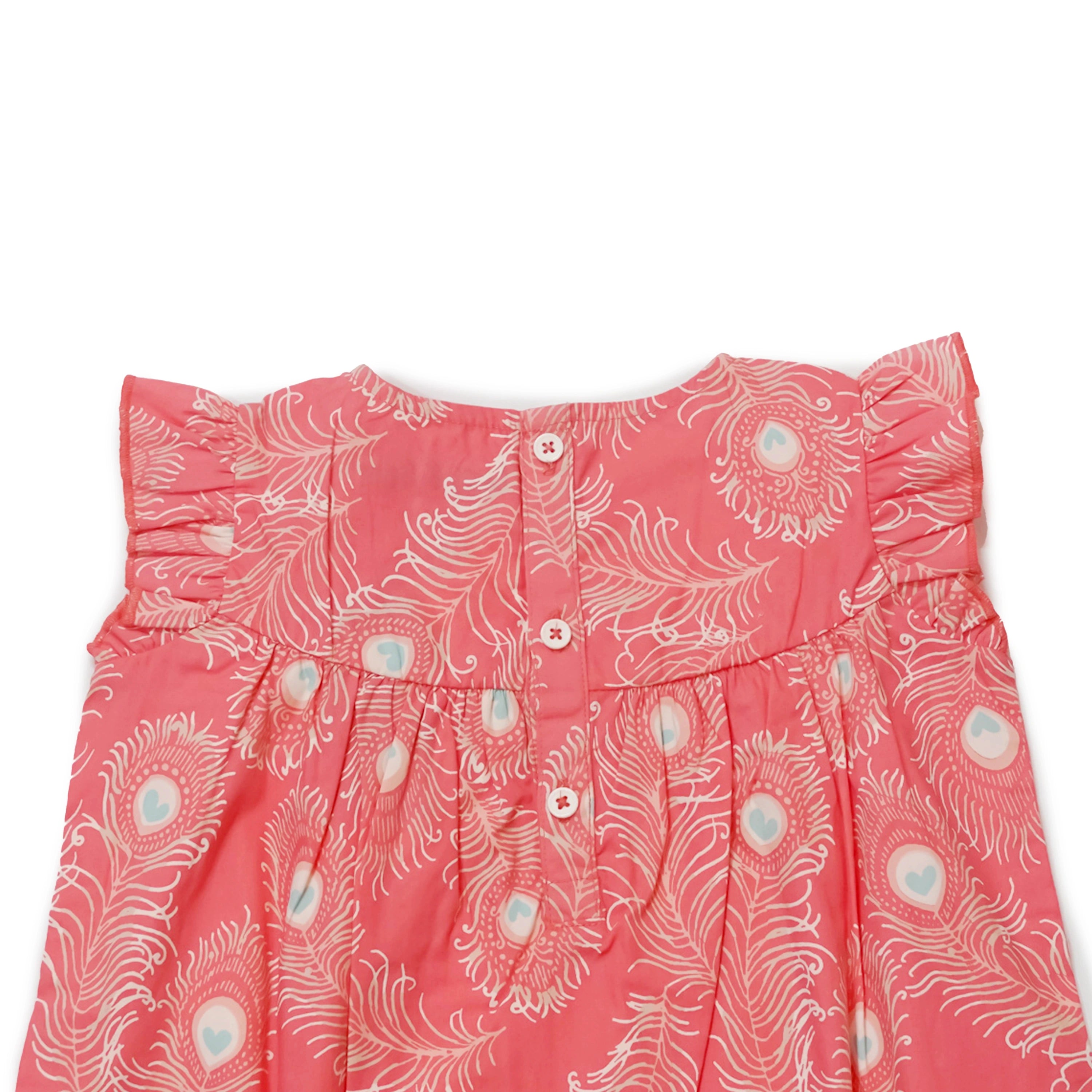 Adorned with an all-over blush pink peacock feather print, complete with sweet heart-shaped eyespots, this dress features delicate ruffled sleeves and gentle gathering at the chest for a soft, floaty silhouette. Designed for comfort and style, it’s an effortless option for both everyday wear and special occasions.