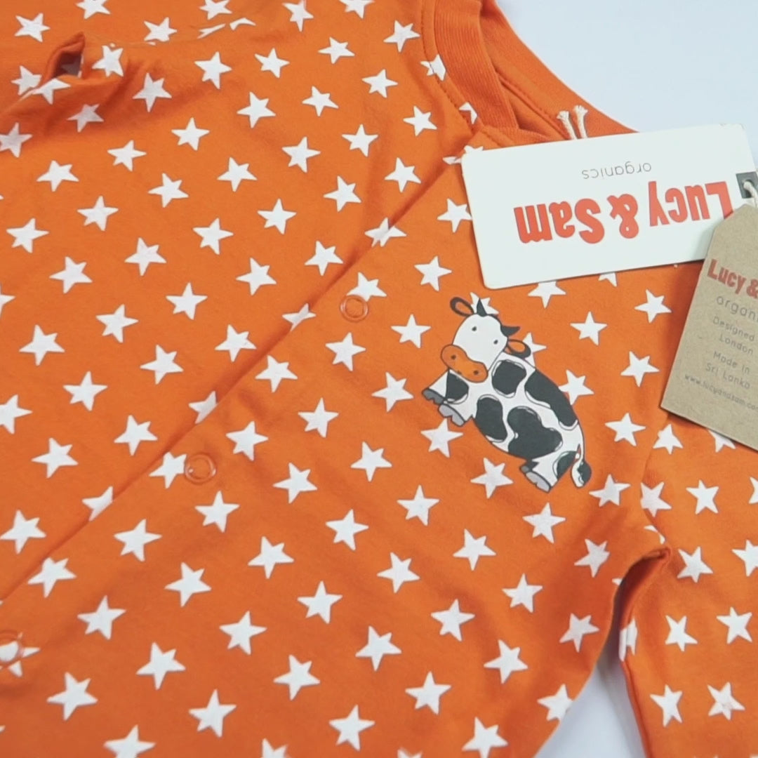 With a warm pumpkin hue and scattered star print, this design brings a cozy, celestial feel to your baby’s wardrobe. Featuring a hand-drawn cow motif, it adds a playful nod to nature. The easy popper fastening makes dressing and nappy changes simple, while built-in feet and fold-over mitts (on smaller sizes) ensure tiny hands and toes stay snug.
