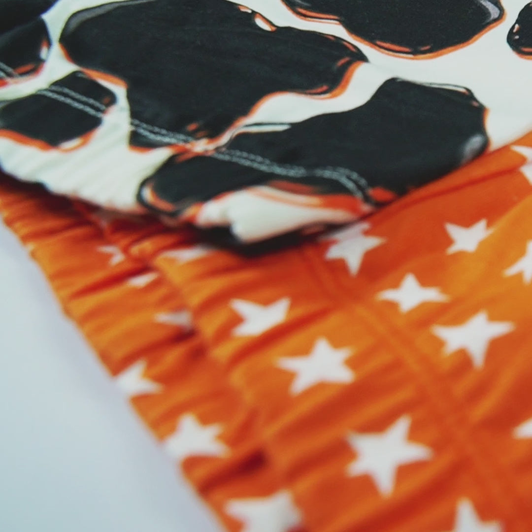 This set includes two playful designs: one with a bold cow print and the other in a pumpkin hue with scattered white stars. The elasticated waistband ensures a snug yet comfy fit, while the stretchy fabric allows for freedom of movement—perfect for playtime, nap time, or anytime.