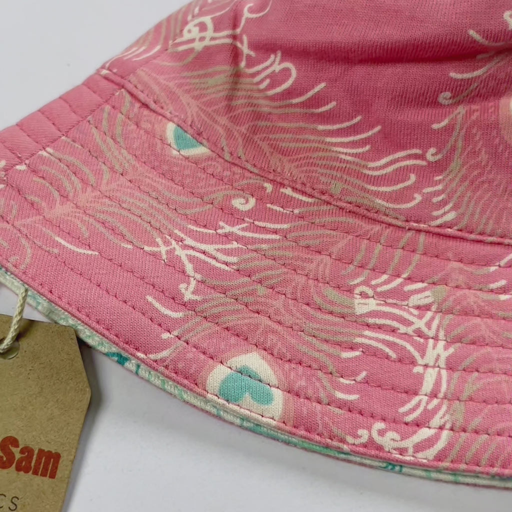 Two looks in one! One side features a cream base with teal peacock feathers and heart-shaped eyespots, while the reverse offers a blush pink version of the same enchanting print. The wide brim provides shade and protection for sunny days, while the soft fabric ensures comfort for even the most sensitive skin.